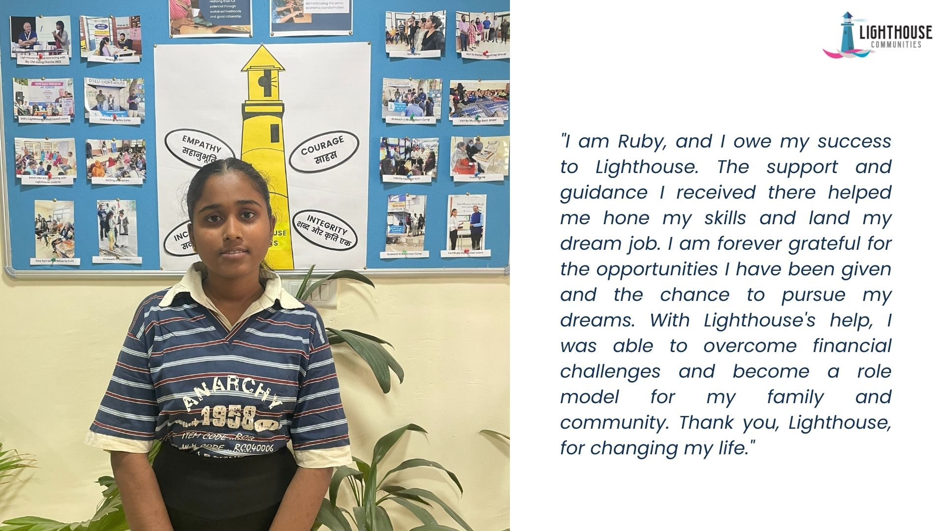 At Lighthouse, Ruby developed her soft skills and was given the opportunity to intern as a spoken English trainer. This internship was a turning point in her life and helped her hone her skills and gain valuable experience. She also had the chance to explore her passion for languages and started learning Korean. Her hard work and dedication eventually led to a job as a Medical Representative, where she could use her skills and knowledge to help others and contribute to her family’s income.