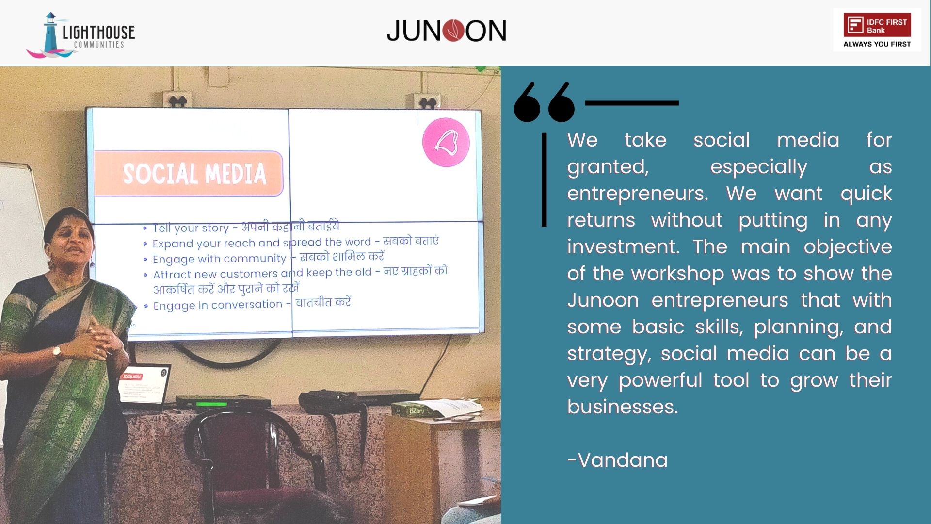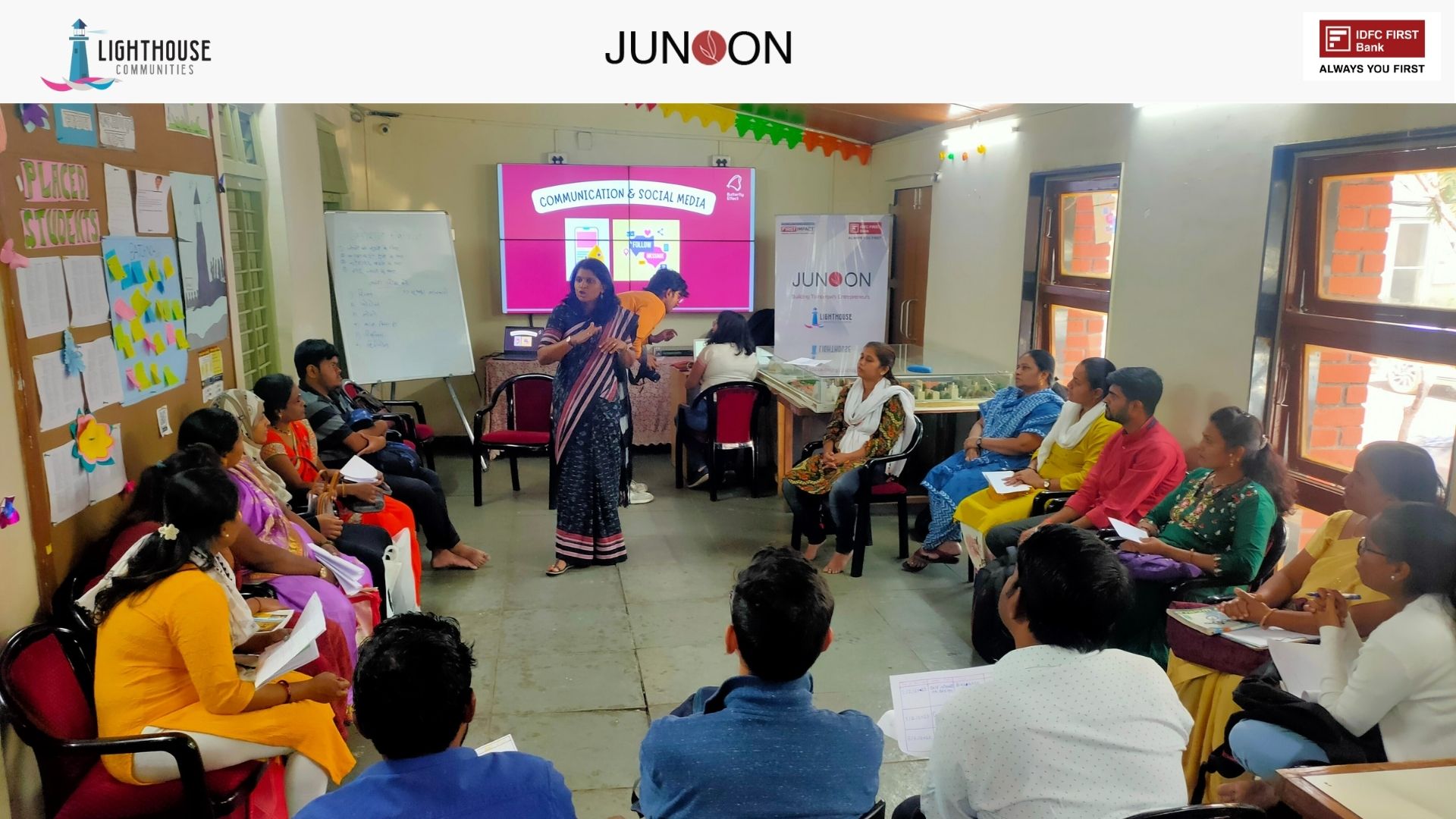 The Social Media Workshop, organised by IDFC FIRST Bank at Lighthouse in Aundh, Pune, on January 10th and 11th, 2023, was a game-changer for our 23 “Junoonis.” Led by facilitator Ms. Vandana from our partner organization Butterflyeffect Media, on day one, the workshop delved into the do’s and don’ts of social media for businesses, including effective strategies for storytelling, audience engagement, and expanding reach.