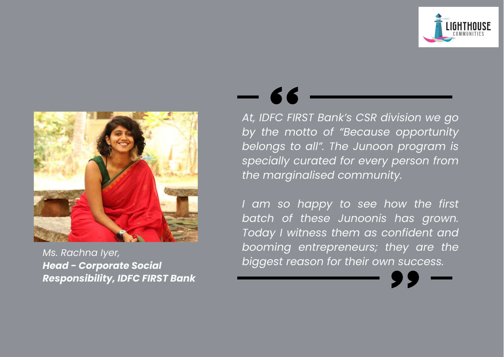 The Launch event and Graduation Ceremony were attended by the entire team of the Junoon program, senior members from the Lighthouse Communities Foundation, and the entire CSR team of the IDFC FIRST Bank.