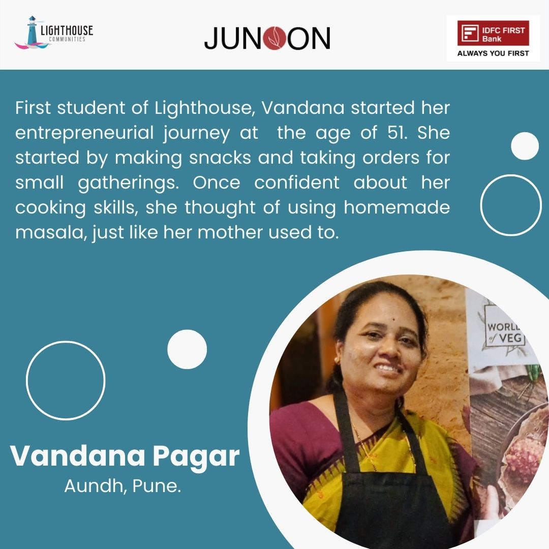 Before joining the Lighthouse, Vandana had completed a Food Processing course from Industrial Training Institute (I.T.I.), Aundh, but she lacked the support and knowledge to do something independently. The Lighthouse gave her a platform to organize her ideas and kick-off her business.